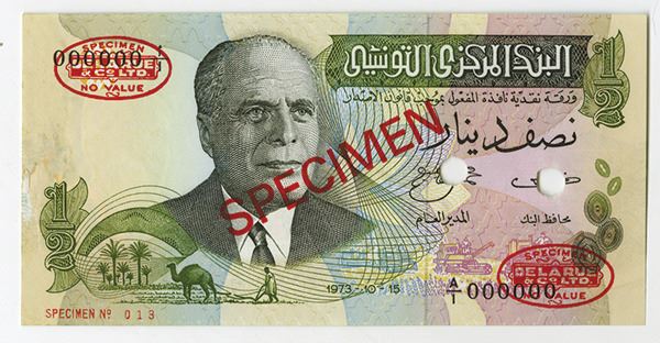 Tunisia. Specimen 1/2 Dinar, 1973-10-15, P-67s, Specimen No. 013, TDLR oval overprints. Choice About Uncirculated with mounting traced on reverse.