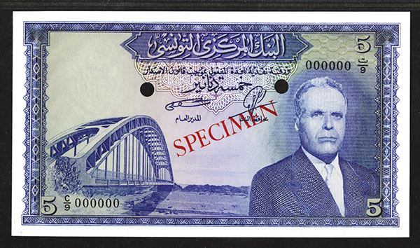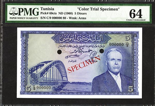 Tunisia. Color trial specimen 5 Dinars, P-60, PMG graded Choice Uncirculated 64. Zero serial numbers, punch hole cancelled, and overprinted SPECIMEN. Rare type.