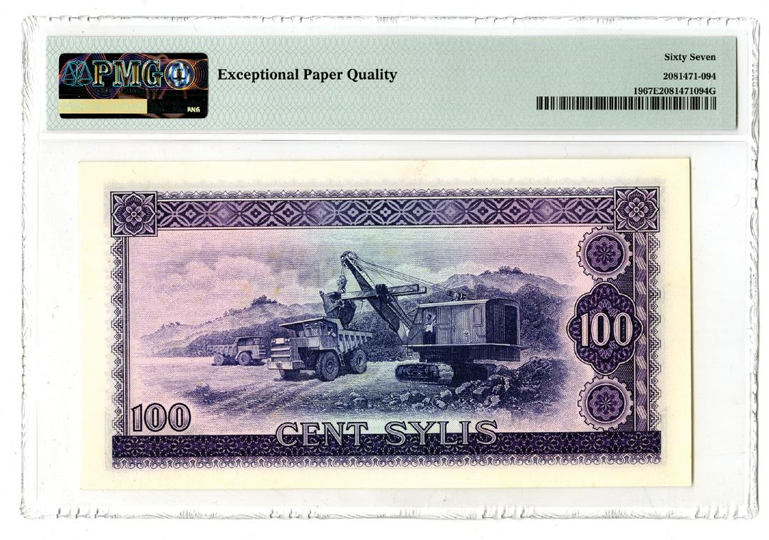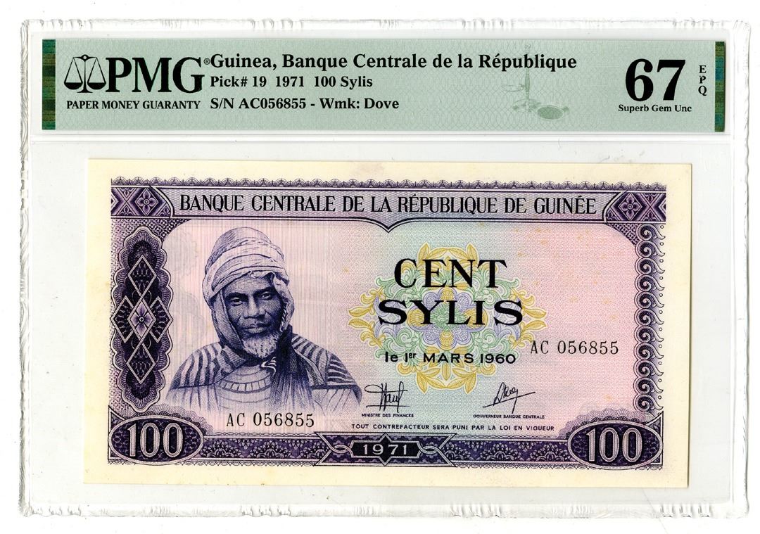 Guinea, 1971. 100 Sylis, P-19, Issued Banknote, Purple on m/c underprint with Man at left, S/N AC056855, PMG graded Superb Gem Uncirculated 67.