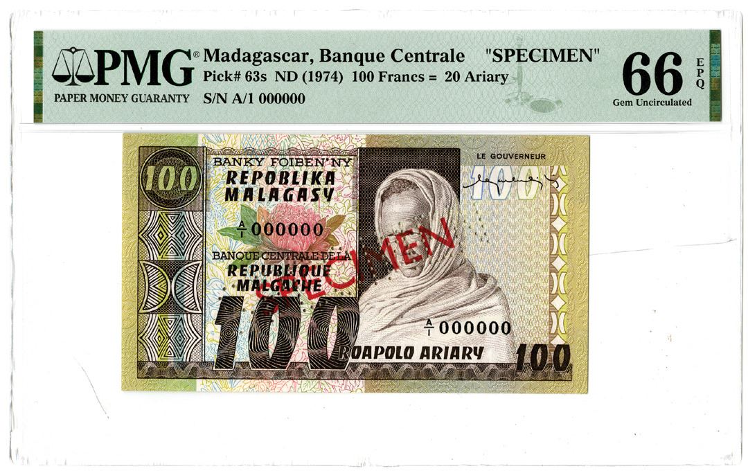 Madagascar... ND (1974). 100 Francs = 20 Ariary, P-63s, Specimen Banknote. Brown on m/c underprint with old man at right with red specimen and POC specimen across face. S/N A/1 000000. PMG graded Gem Uncirculated 66 EPQ. (From the Allen Berk Collection)