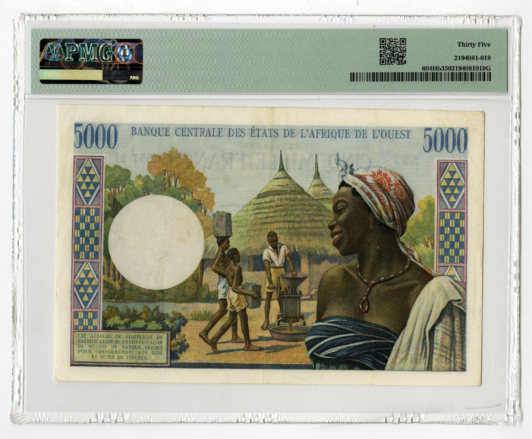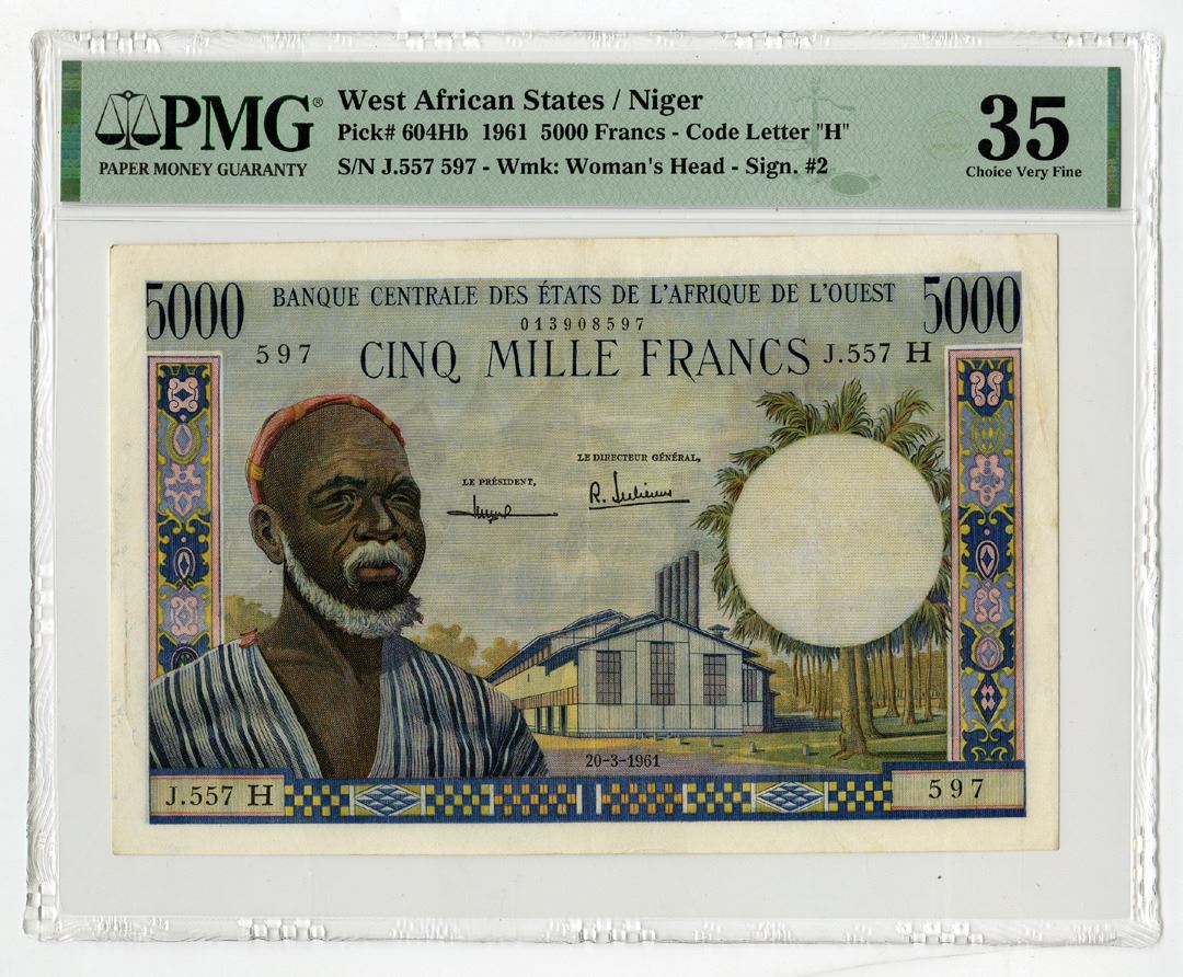 West African States - "H" - Niger, 1961, 5000 Francs, P-604Hb. Signature #2, Man with beard at left, factory at right, S/N J.557 597, PMG graded Choice Very Fine 35. Attractive large format note. This is the highest and only graded note for this variety and year to be offered at auction.