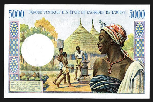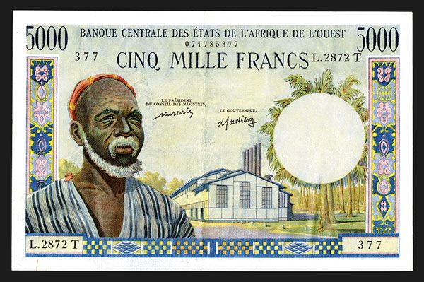West African States - Togo. 5000 Francs, P-804Tm. Signature 11. Choice VF to XF, an old fold keeps this from a better grade.