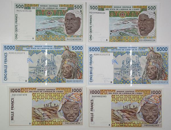 West African States. Lot includes a group of 500, 1000, and 1000 Francs notes (two of each). P-210B; 213B; 211Be. Choice to Gem Unc. Sold "As is" no returns accepted for group lots. (6)
