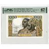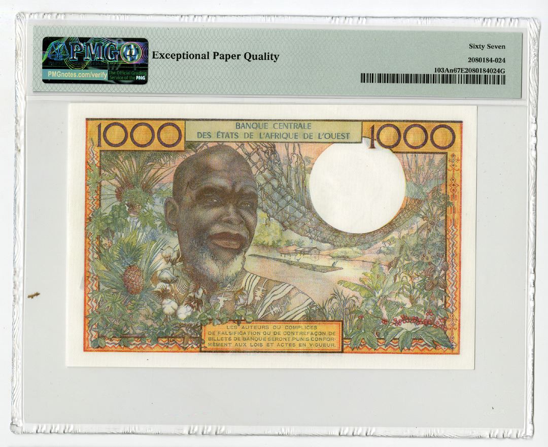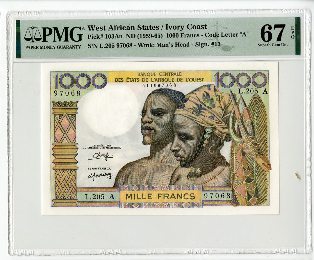West African States - Ivory Coast. ND (1959-1965). 1000 Francs, P-103An, issued banknote, Signature #13, PMG Graded Superb Gem Unc 67 EPQ. Only 4 notes grade higher out of 41 graded in the PMG census. Rare in high grade and almost impossible to improve upon.