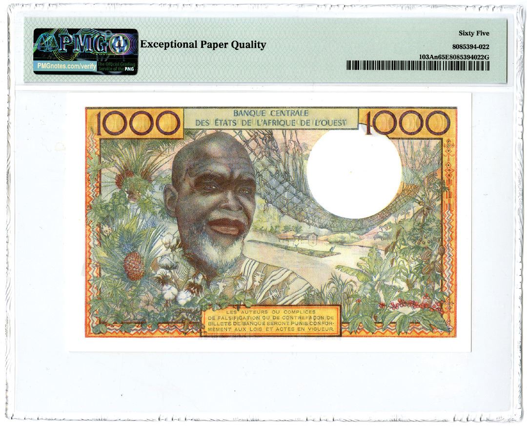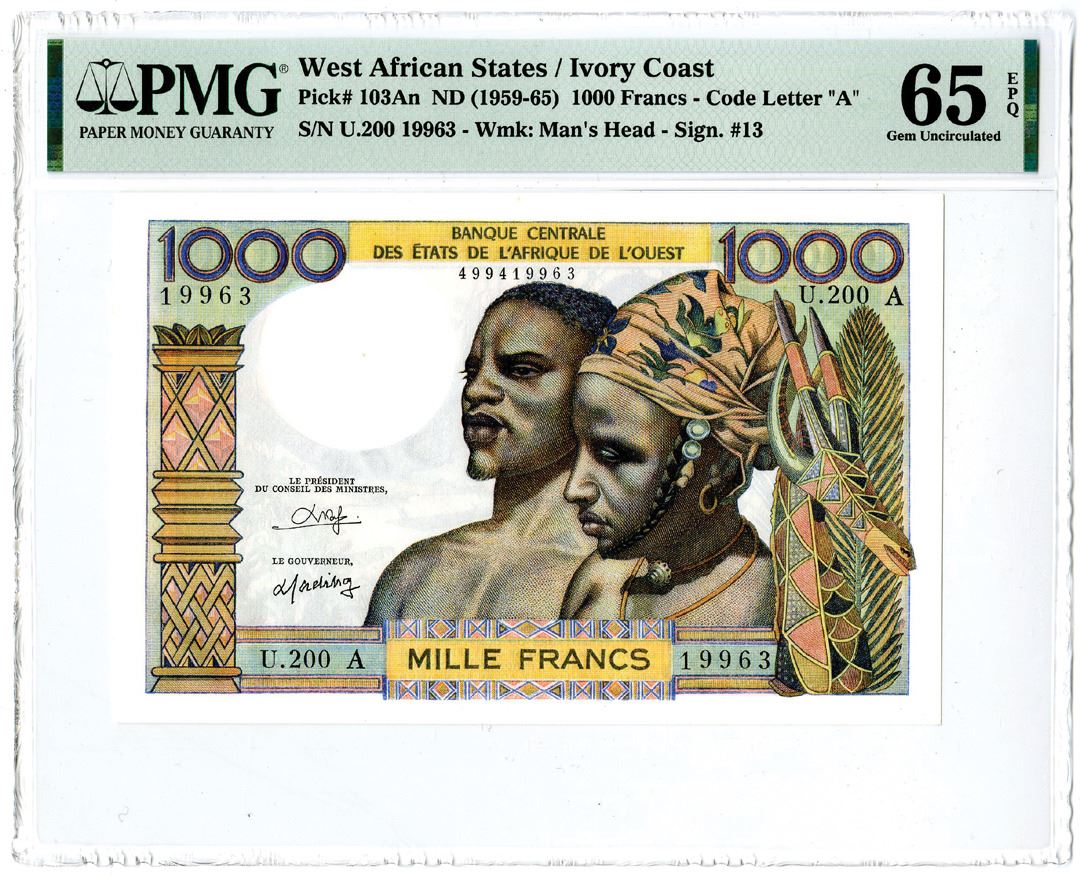 West African States/Ivory Coast. ND (1959-65). 1000 Francs - Code Letter "A", P-103An, Issued Banknote, Yellow and multicolor, S/N U.200 19963, Watermark: Man's Head - Sign. #13, PMG graded Gem Uncirculated 65 EPQ.