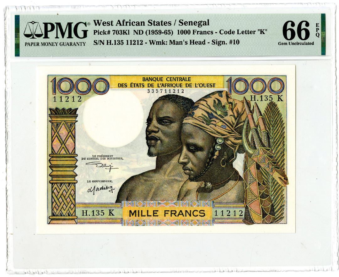 West African States/Ivory Coast. ND (1959-65). 1000 Francs - Code Letter "K", P-703Kl, Issued Banknote, Yellow and multicolor, S/N H.135 11212, Watermark: Man's Head - Sign. #10, PMG graded Gem Uncirculated 66 EPQ.