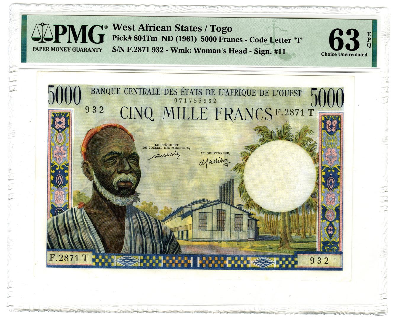 West African States/Togo. ND (1961). 5000 Francs - Code Letter "T", P-804Tm, Issued banknote, Blue and multicolor on face, S/N F.2871 932, Watermark: Woman's Head - Sign. #11, PMG graded Choice Uncirculated 63 EPQ.