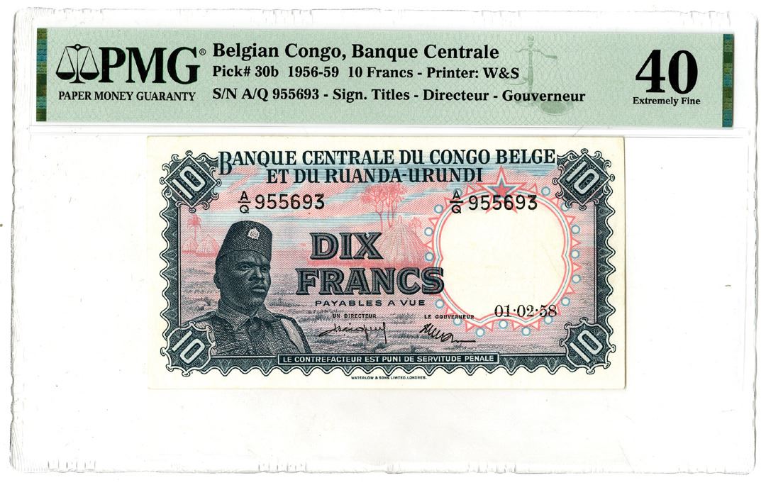 Belgian Congo. 1956-59. 10 Francs, P-30b, Issued banknote, Gray-blue on blue and orange underprint, S/N A/Q 955693, Sign. Titles - Directeur - Gouverneur, PMG graded Extremely Fine 40. Printer: W&S.