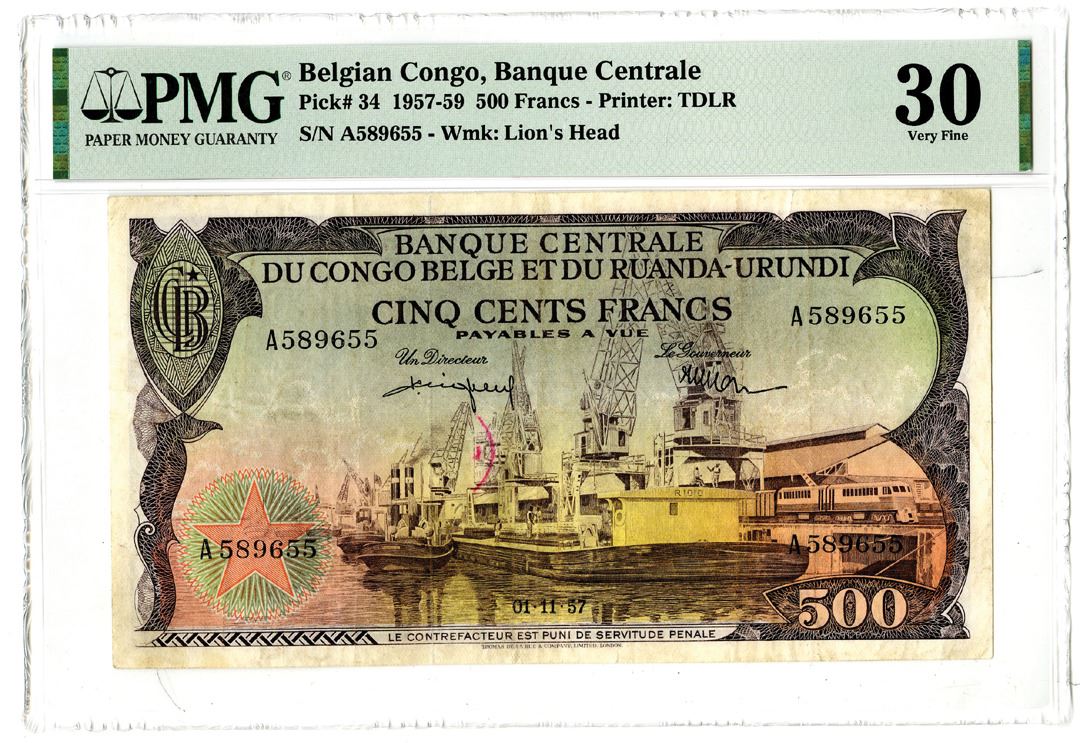 Belgian Congo. 1957-59. 500 Francs, P-34, Issued banknote, Brown-violet on multicolor underprint, S/N A589655, Watermark: Lion's Head, PMG graded Very Fine 30 with comment "Minor Ink". Printer: TDLR.