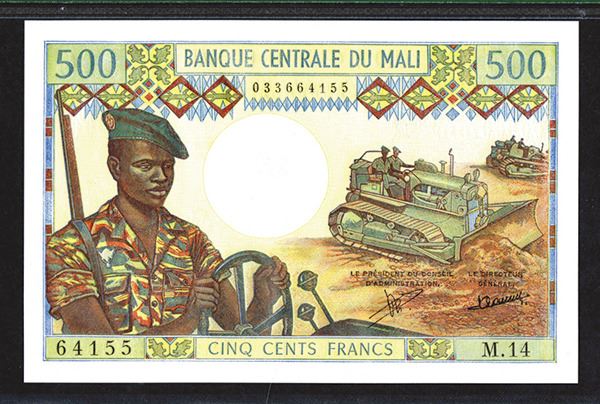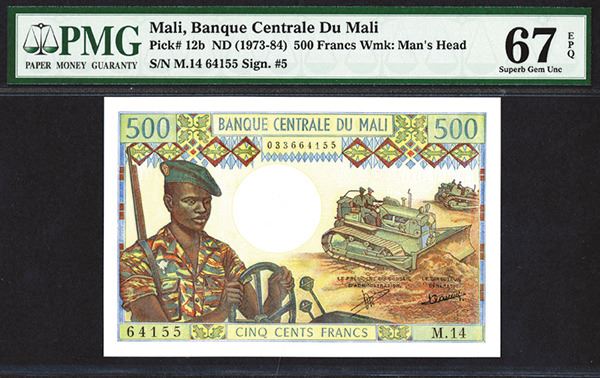 Mali. 500 Francs. P-12c. (Incorrect ID on slab). Military bulldozer construction crew on face, caravan on back. PMG graded Superb Gem Uncirculated 67 EPQ great embossing. Finest graded in census.