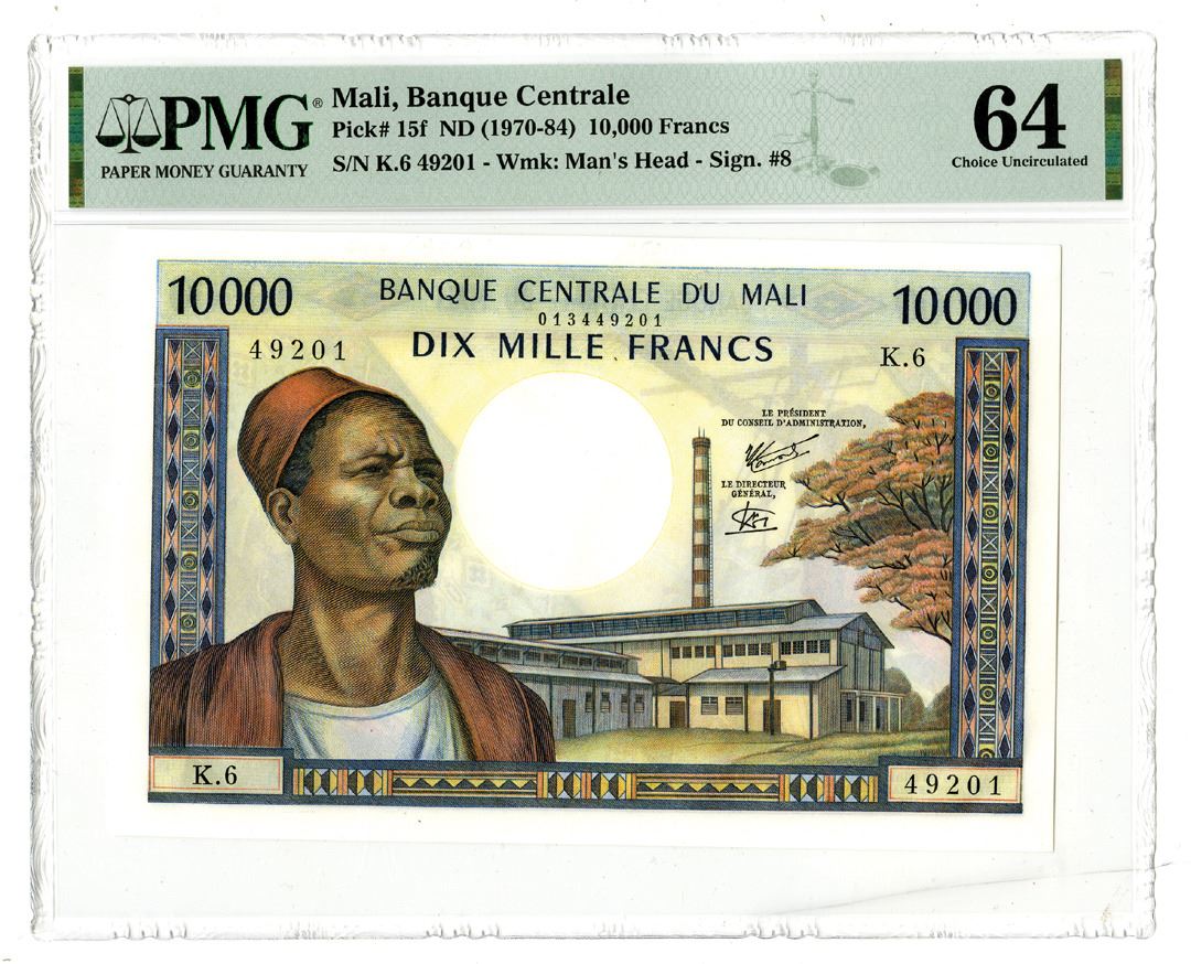 Mali, ND(1970-84). 10,000 Francs, P-15f, Issued Banknote, M/c printing with man at left and building at right, S/N K.6 49201, PMG graded Choice Uncirculated 64 with comment "annotations."