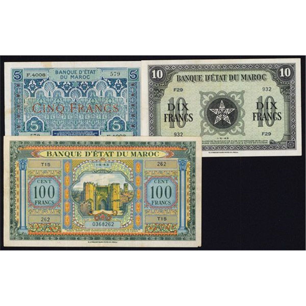 Morocco, Lot of 3 notes, The highlight is a State Bank of Morocco, ND (1924), 5 Francs, P-9, Issued, Blue and green, 4 serial numbers on top and bottom, title in 2 lines, XF to Choice XF condition with one vertical and one horizontal fold, original paper, bright colors, large margins and sharp corners; Also included is a 1943, 10 Francs, P-25 in VF and a 1943, 100 Francs, P-27, in Choice VF. Attractive and original estate group that have not seen the light of day in over 50 years.