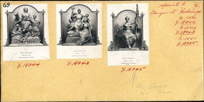 Canada. ca.1917-1935. 3 different proofs printed in black on india paper and mounted to manila archival envelope. All are vignettes from the face of the following banknotes: Banque D'Hochelaga, P-S812, $10, 1917and P-S813, $20; Banque Canadienne Nationale, P-S711, S713 and S717, $5, $10 and $20, ca.1929-1935. All in XF condition. Rare and impressive vignettes. ABNC