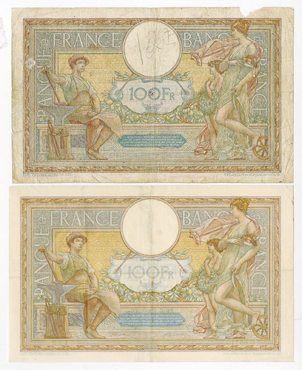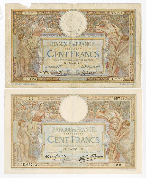France. Lot of 2 notes, Includes 1918, 100 Francs, P-71a, Good to VG with small tears and pieces missing; and 1939, 100 Francs, P-86b, a Nice VF.