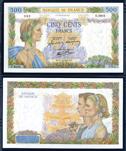 France, 1942. 500 Francs, P-95b, Pax with wreath at left, S/N U.6902 592, PMG graded Superb Gem Uncirculated 67 EPQ, Extremely attractive large size note with none graded higher.