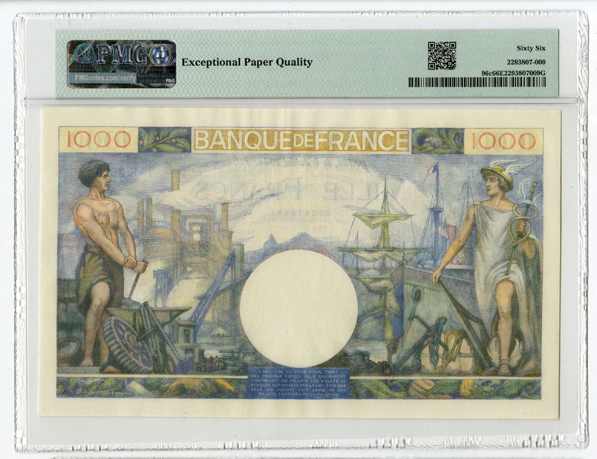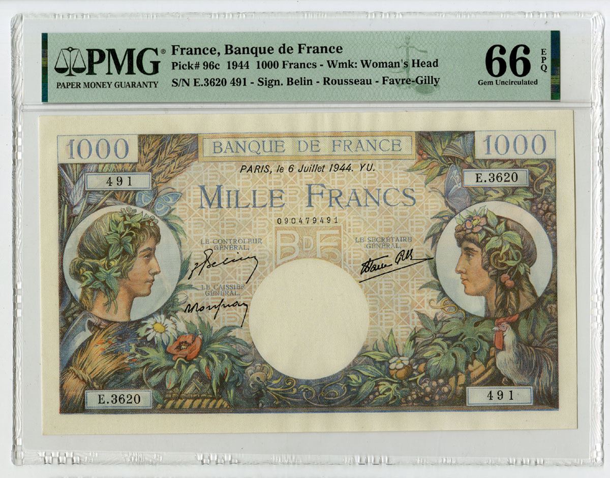 France, 1944. 1000 Francs, P-96c, Issued Banknote, M/c printing with women facing each other on left and right, Back is m/c with allegorical men at left and right, S/N E.3620 491, PMG graded Gem Uncirculated 66 EPQ.