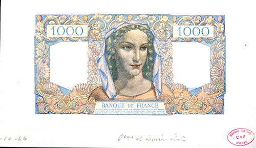 France, ND (ca.1944), 1000 Francs, P-Unlisted, Proposed essay design that was not adopted, uniface front proof on thin paper, AU condition, oval red overprint on lower right “Clement Serveau - C*F - Paris”. Extremely rare and desirable French essay banknote.