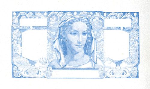 France, ND (ca.1944), 1000 Francs, P-Unlisted, Proposed essay design progress proof of only the blue color that was not adopted, uniface front proof on thin paper, Uncirculated condition, oval red overprint on lower right “Clement Serveau - C*F - Paris”. Extremely rare and desirable French essay banknote.