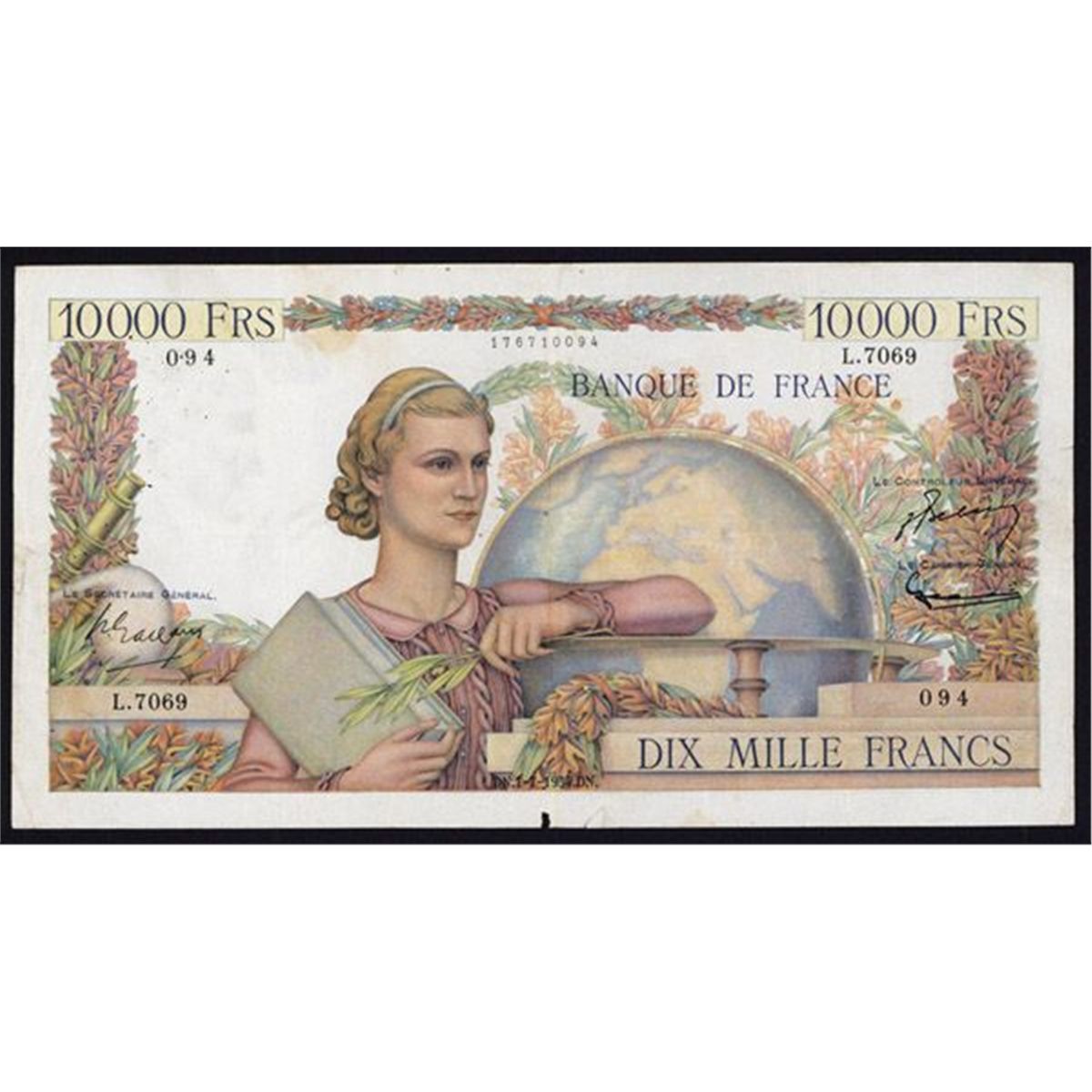 France, 1954, 10,000 Francs, P-132d, Issued, m/c, Young woman with book and globe, Signature d'Ambrieres and Gargam, Fine to VF with an small piece out of the middle bottom margin and a small 3 mm tear next to it, otherwise, there are no other major issues, sharp corners, large margins, a couple of extremely small rust spots on the top margin but very attractive for this large sized issue.