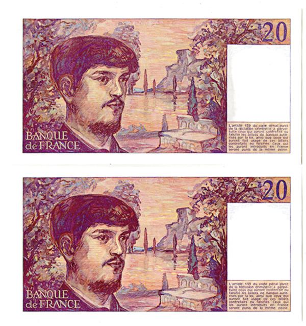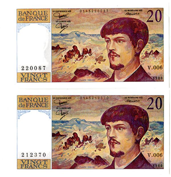 France, Lot of 2 notes, both are 20 Francs, 1980 issue, P-151a, Both in AU to Choice AU condition. (2)