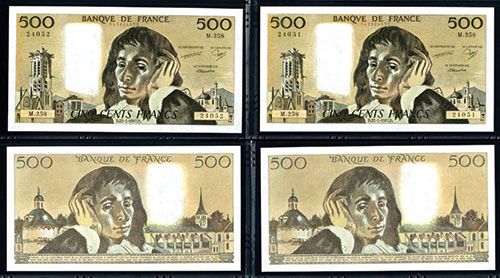 France, 1987. 500 Francs, P-156f, Stroh - Ferman - Dentaud Signatures, Blaise Pascal at center, S/N's M.258 24051 and 24052, both notes PMG graded Superb Gem Uncirculated 67 EPQ, Included are 2 of the 3 graded at this level and the highest grade given for this issue, these Superb Gems will be difficult if not impossible to improve upon.