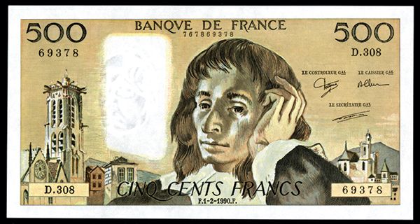 Banque De France, 1990 High Grade Sequential Pair of Banknotes. France, 500 Francs, P-156g, Ferman - Dentaud Signatures, Blaise Pascal at center, S/N's D.308-69378 and 69379, both notes PMG graded Superb Gem Uncirculated 67 EPQ, Included are 2 of the 4 graded at this level and the highest grade given for this issue, these Superb Gems will be difficult if not impossible to improve upon.