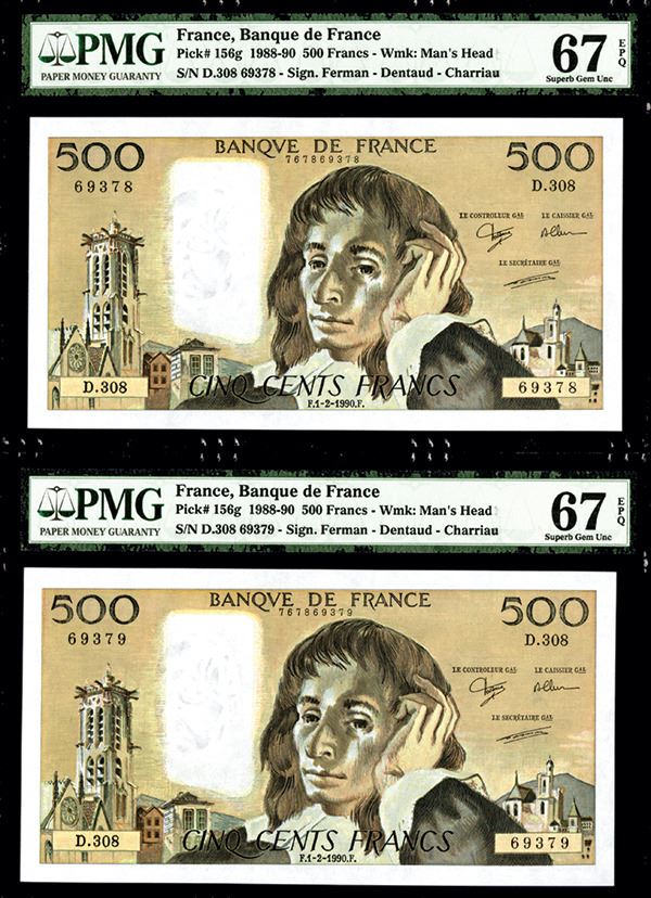 France, 500 Francs, P-156g, Ferman - Dentaud Signatures, Blaise Pascal at center, S/N's D.308-69378 and 69379, both notes PMG graded Superb Gem Uncirculated 67 EPQ, Included are 2 of the 4 graded at this level and the highest grade given for this issue, these Superb Gems will be difficult if not impossible to improve upon.