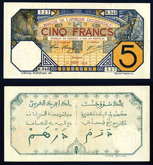 Dakar, French West Africa, 5 Francs, P-5Ba, blue and yellow, lion on UL, appears XF but has been pressed sometime in the past, still very attractive note with the appearance of a higher grade.