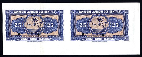 French West Africa, Lot of 2 notes as uncut pair, ND (1942), 25 Francs, P-30s, specimen banknote without Serial numbers or overprints, only POC's, Black on light green underprint, woman on left, back blue on brown underprint with palm trees and airplane, large excess margin on bottom and large margin on top, The left side note is Choice to Gem Uncirculated Condition, the right side has a vertical fold in it and would grade Choice AU, Scarce notes as specimen, E.A.Wright BNC.