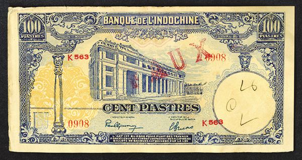 French Indo-China. ND (1946), 100 Piastres, P-79x. Counterfeit banknote. Red "Faux" on face with serial numbers in red. Blue on m/c with building on face and sampans on back. XF+ to AU with minor handling on left edge and top left corner. Scarce and historic note used by the Vietnamese nationalists to undermine the French occupation.