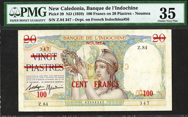 New Caledonia, 100 Francs on 20 Piastres - Noumea, P-39, Issued banknote, Overprint on French Indochina #56, Brown, blue and m/c, S/N Z.84-347, PMG graded Choice Very Fine 35, Scarce note in any condition.