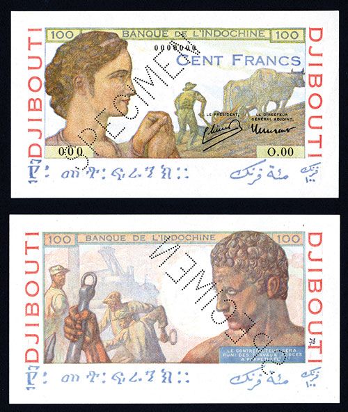 Djibouti, French Somaliland, ND 1946), 100 Francs, P-19A Unlisted Specimen, woman at left, man plowing at right, back with man at right, Pin punch Specimen and S/N 000, 0.00, Appears Uncirculated but a very light fold keeps this lovely note AU to Choice AU condition.