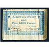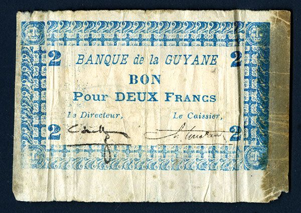French Guiana, 2 Francs, P-11A, Issued banknote, Blue-green with black signatures, black oval handstamp on back, The note is intact with the lower left corner tip missing, appears Fine to Choice Fine with evidence of previous mounting and stains on the right and left margins, still scarce in any condition.
