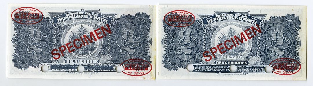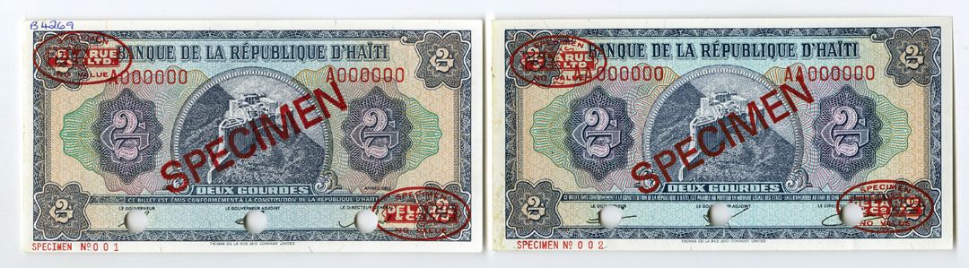 Haiti, Lot of 2 Specimen notes, Both with TDLR oval Specimen overprints in the corners, Includes 1 prefix variety of Loi Du 1979, 2 Gourdes, P-245As, Specimen, S/N's "AA 000000", CU condition with evidence of previous mounting on the back right edge, overprinted on lower left border Specimen No. 002, POC's; and 1992, 2 Gourdes, P-260s, S/N "A000000", overprinted on lower left border Specimen No. 001, CU with very light mounting remnants on back right edge, Attractive pair of Specimens. TDLR.