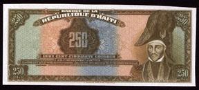 1979, 250 Gourdes, P-237 Unlisted unfinished specimen without punch cancels, serial numbers, seals, series or dates. Dark yellow green on m/c, portrait of Dessalines on right, back with arms of Haiti. Printed on unwatermarked Tyvek paper. Uncirculated to Choice Uncirculated Condition. Extremely rare and attractive Tyvek banknote variety. ABNC.