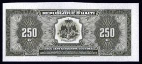 1979, 250 Gourdes, P-237 Unlisted unfinished specimen. The back is completely printed, but the front only has the m/c underprint and no vignette, border, text or designs. The note has no punch cancels, serial numbers, seals, series or dates. Back with arms of Haiti. Printed on unwatermarked Tyvek paper. Uncirculated to Choice Uncirculated Condition. Extremely rare and attractive Tyvek banknote variety. ABNC.