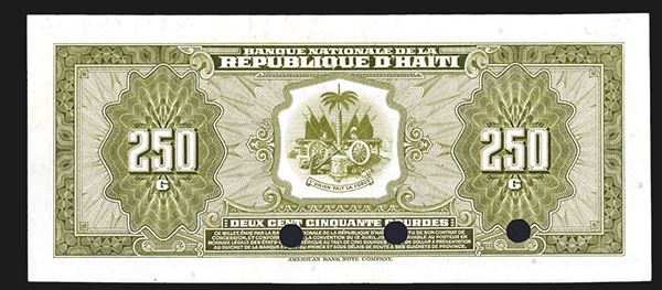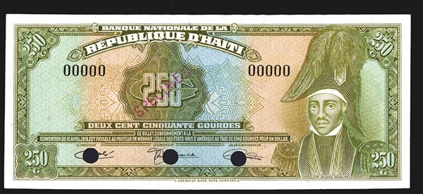 Haiti, 1979, 250 Gourdes, P-237s. Tyvek banknote specimen. Black "00000" serial numbers. Red Specimen overprint and punched out cancels. 3 different signatures in signature block. Choice Uncirculated Condition. Rare and attractive Tyvek banknote. ABNC.