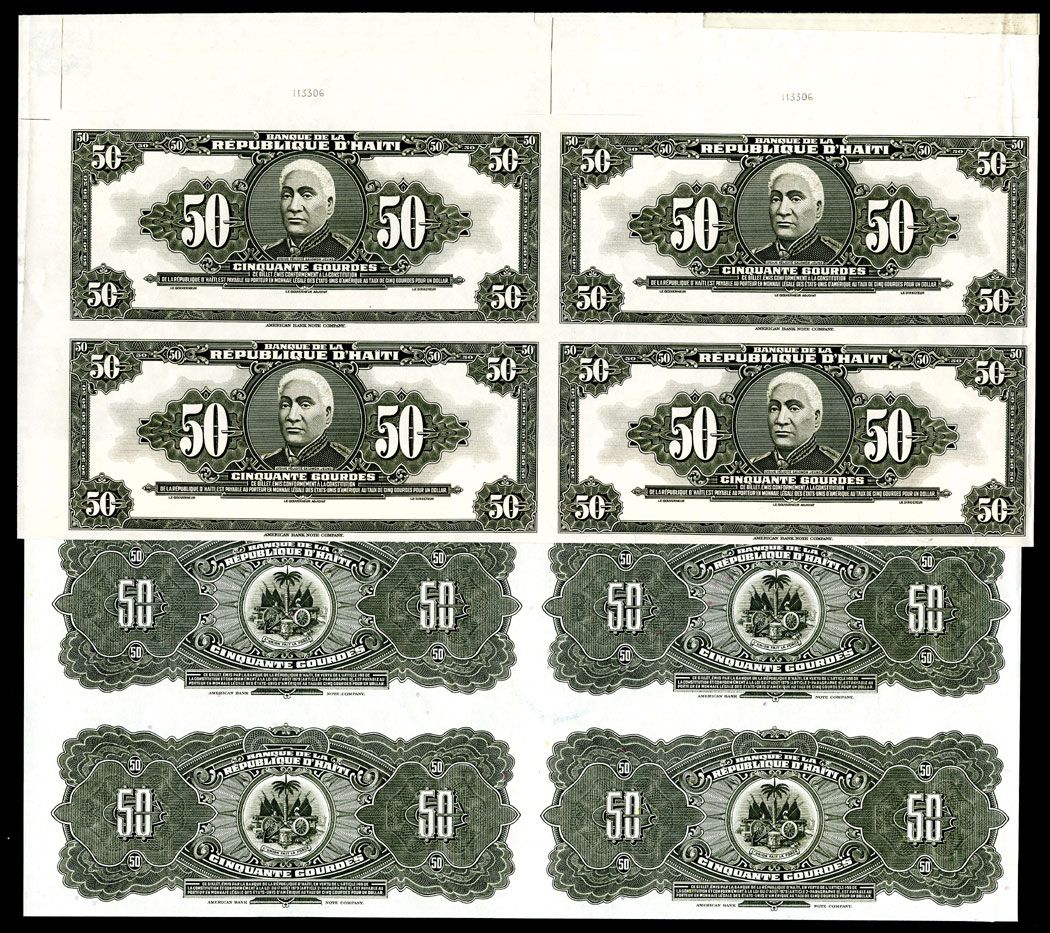 Haiti, 50 Gourdes, two uncut sheets of 4 proof subjects each (one sheet obverse, the other reverse), The face on white planchetted banknote paper with plate numbers for obverse side. Dark green. Back on white paper, Vignette of Arms of Haiti. Unlisted as proof in Pick. Left 2 notes are Choice Unc., and the right 2 notes have light fold on the right margin where sheet was folded for storage. Rare proof. ABNC.