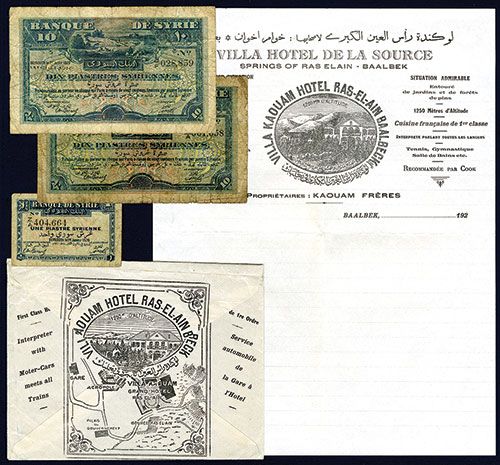 Beyrouth, Syria, Lot of 3 notes, 1 letterhead and 1920's Letterhead with matching illustrated envelope. Includes 1920, 1 Piastre, P-6, Fine and 2 examples of 1920, 10 Piastres, P-12, one VG and one Fine to Choice Fine, all BWC; also included is an illustrated letterhead for a resort hotel “Villa Kaouam Hotel Ras-El-Ain Baalbeck, located in Baalbeck. Interesting assortment of Syria material.