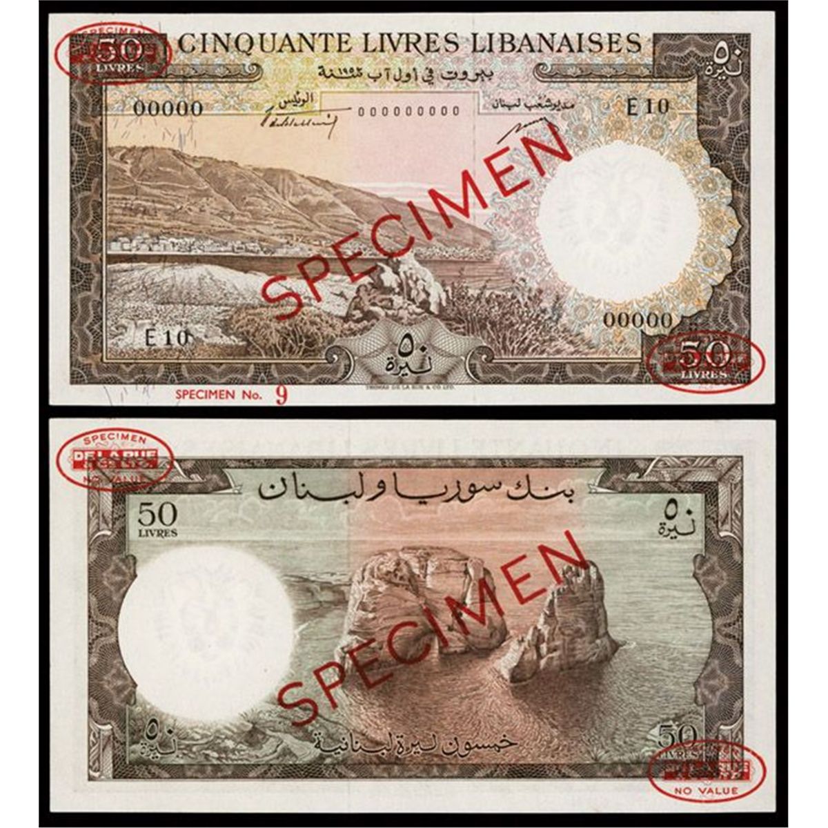 Lebanon, 1952, 50 Livres, P-59s Specimen, Brown on m/c, Coast landscape, back brown on m/c, S/N 00000 and Series Number E10, SPECIMEN overprint in red, POC, Specimen No. 9 on bottom margin, TDLR oval seals in red on top left and lower right, Security strip, Choice to Gem Uncirculated Condition. TDLR.