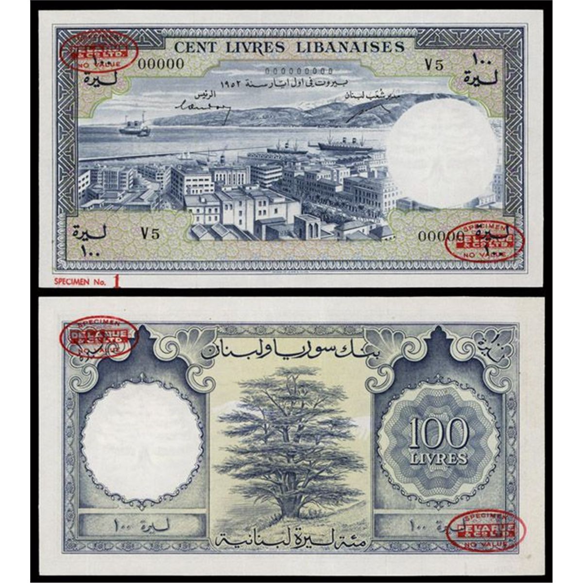 Lebanon, 1952, 100 Livres, P-60s Specimen, Blue on m/c, Beirut and harbor scene, back blue, S/N 00000 and Series Number V5, SPECIMEN overprint in red on back only, POC, Specimen No. 1 on bottom margin, TDLR oval seals in red on top left and lower right, Security strip, Choice VF to XF Condition due to archival folds. TDLR.