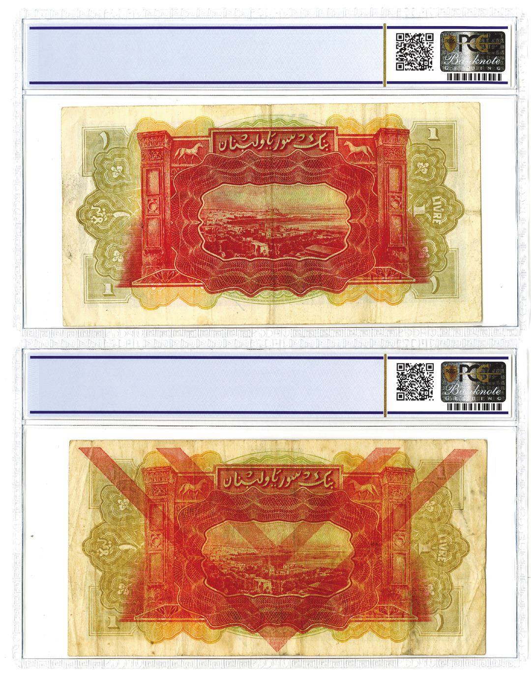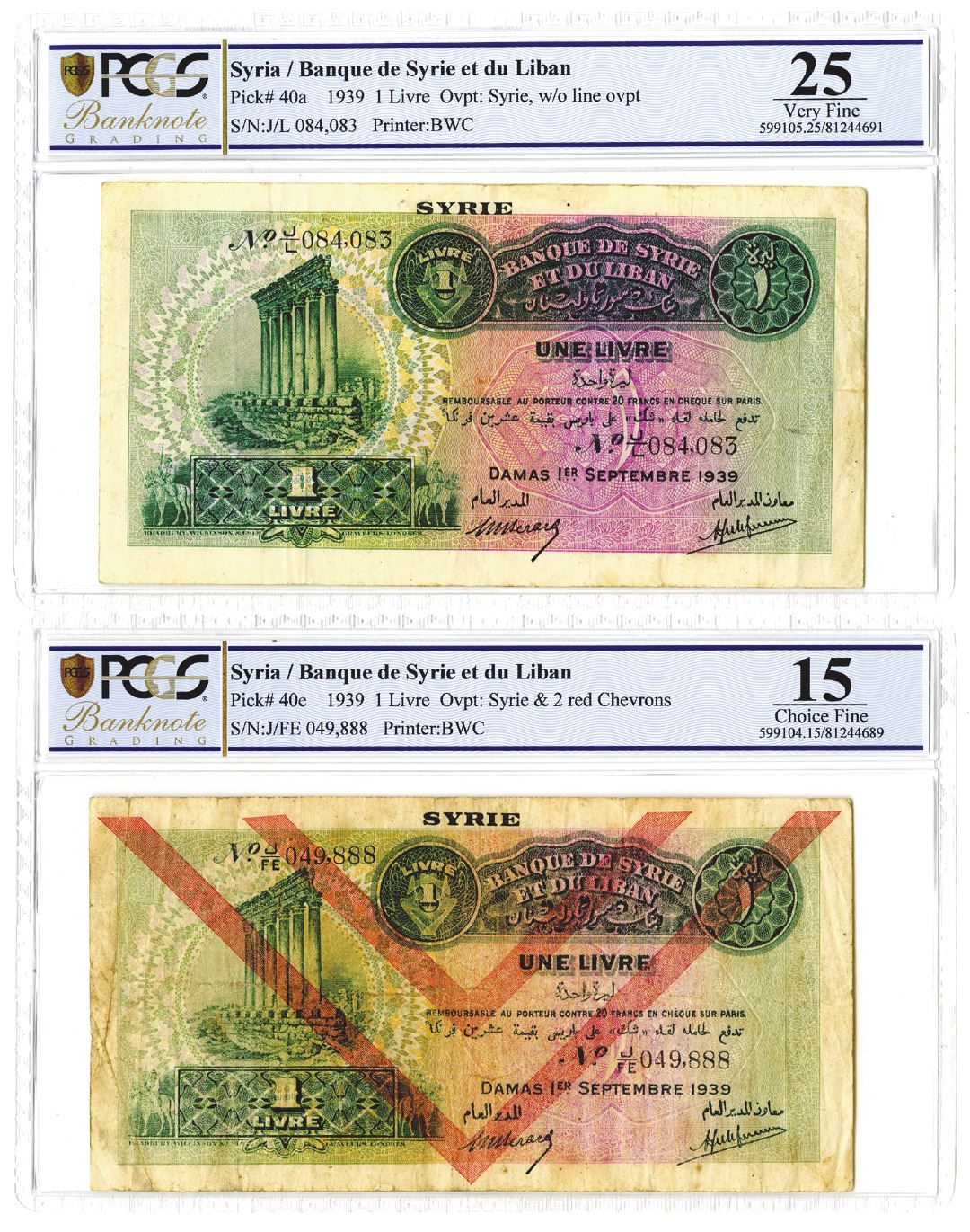 Syria, 1939, Lot of 2 notes, Includes 1 Livre, P-40a, Overprint: Syrie w/o line ovpt., PCGS graded Very Fine 25; and, 1 Livre, P-40e, Overprint: Syrie and 2 red Chevrons, PCGS graded Choice Fine 15, BWC. (2)