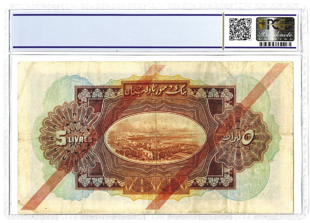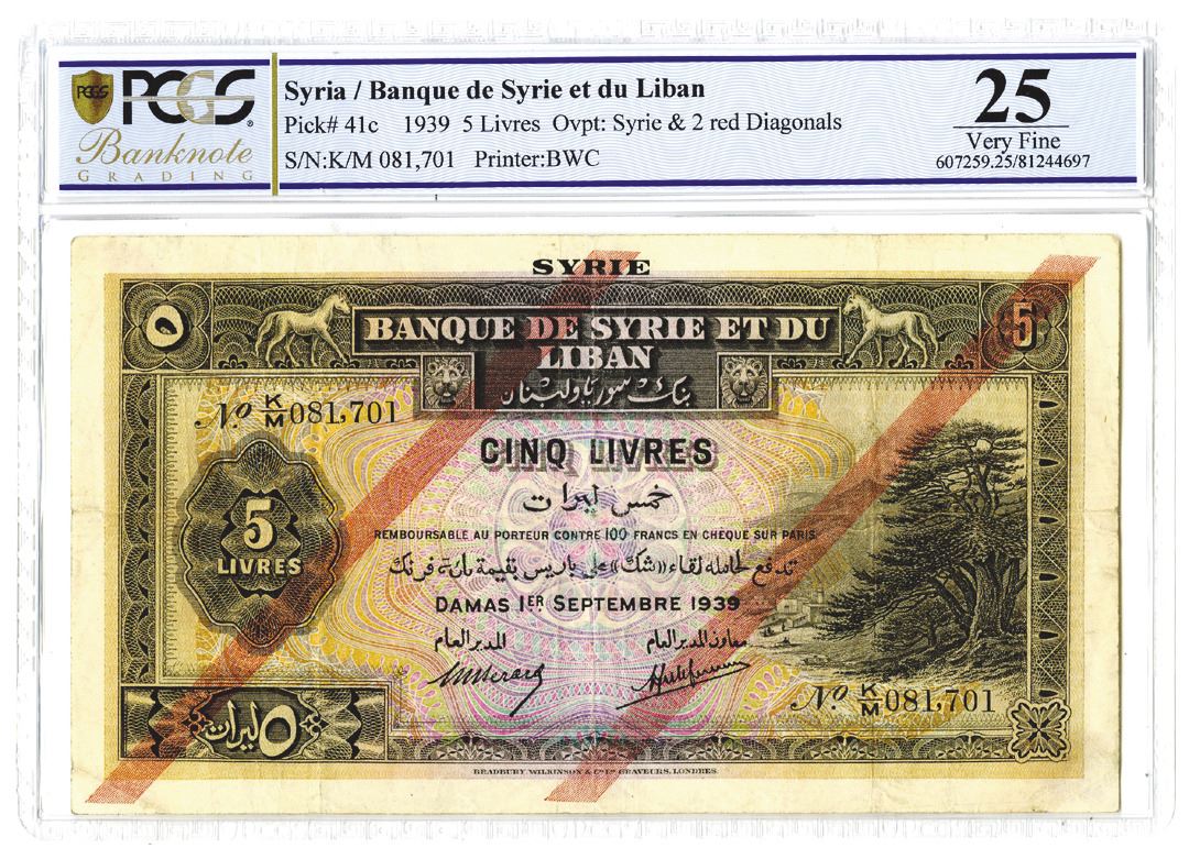 Syria, 1939, 5 Livres, P-41c, Issued banknote, Overprint: Syrie and 2 red diagonal lines, PCGS graded Very Fine 25 but evidently conservatively graded since it appears to be a higher grade than listed, BWC.