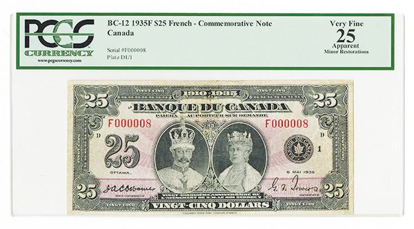 Ottawa, Canada. 6 May, 1935. $25, BC-12, 1935F, Plate D1/1, Issued banknote, Portraits of King George V and Queen Mary at center, Black on light purple underprint, back purple with Chateau de Windsor portrait in middle. Osbourne | Towers signatures, Extremely low single digit serial number "F000008", PCGS graded Very Fine 25 apparent with note of minor restoration which is difficult if not impossible to view. Large even margins, bright colors, fresh firm paper and the extremely low serial number only add to the desirability of this rare note that is sure to demand the attention of the advanced Canadian collector.
