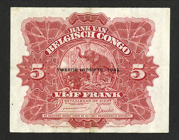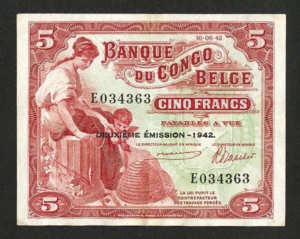 Belgian Congo, 5 Francs, P-13, Issued banknote, Deuxieme Emission - 1942, S/N E034363Red on green underprint, Woman seated with child by beehive, back red with elephant, XF to Choice XF with bright colors, sharp corners, and large even margins, W&S.