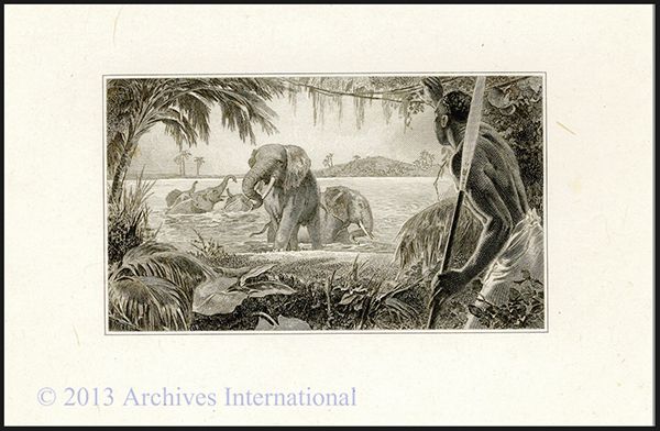 Banque Du Congo Belge, ND 1941 Issue, Back Proof Vignette used on 500 Francs ABN Issue. Belgian Congo, 500 Francs, P-18 or 18A, Large die proof of elephants bathing used on back of this rare note. Printed on india paper on large card in dark brown black. The india paper is in excellent condition but the excess margin card has a few light foxing spots. Rare production proof from ABN Archives.