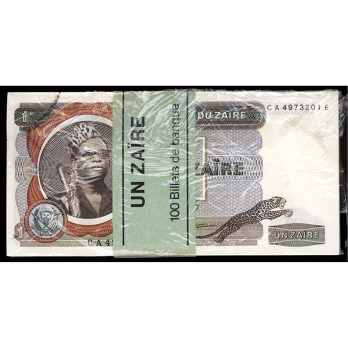 Zaire, 1977, Original Uncirculated Pack of 100 Notes, 1 Zaire, P-18b, Issued Mobutu at left, Elephant tusks on back, Note appear choice to gem uncirculated, G&D printer.