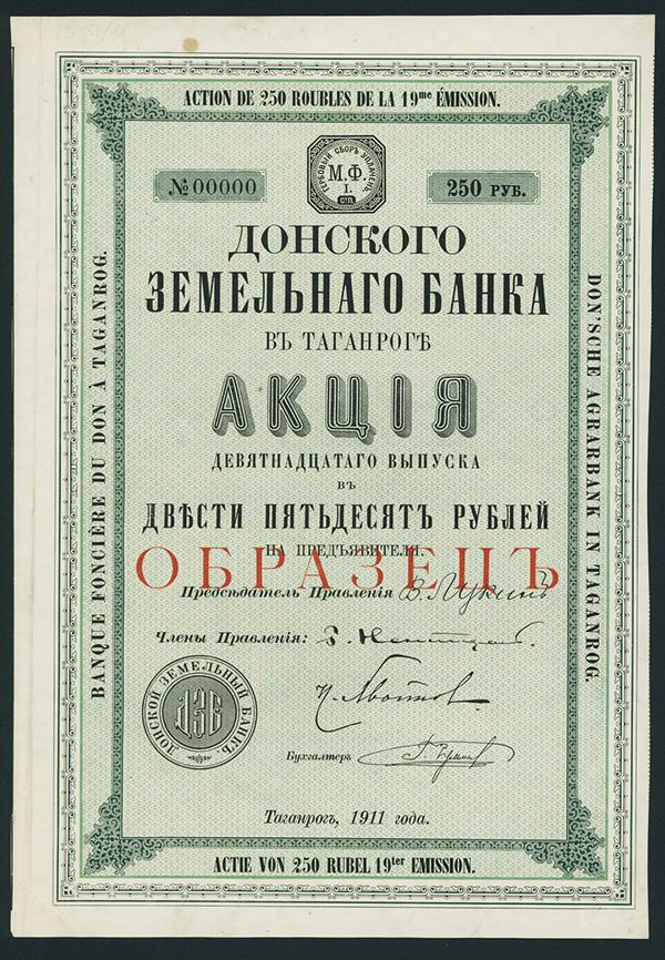 1911. 250 Rubles, 19th Emission, Specimen bond, "00000" serial numbers and red specimen overprints. The bond looks in XF condition but there are 2 small holes from storage in file on the upper and lower left. Rare Russian specimen bond.