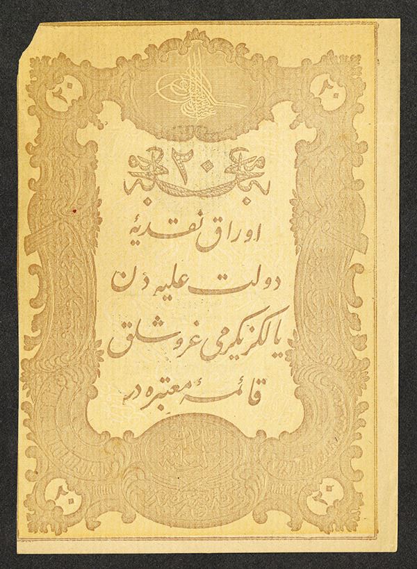 Turkey. 20 Kurush. P-49b. Toughra of Abdul Hamid II at top. Circular and Rectangular hand stamps on back AH1294 / 1877 dated. Light paper tone as expected due to the paper stock. Bold print embossing. Choice Extremely Fine, chip from top left corner.