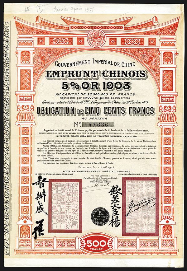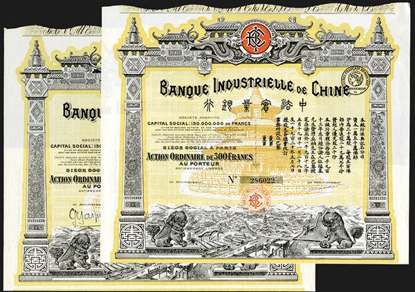 China, Banque Industrielle De Chine, 500 Francs, 1920 Bond. I/U, VF condition.